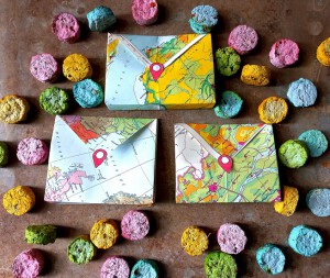 Inhoud: Vier BermBLOMMEN in een handgemaakte verpakking van oude landkaarten.