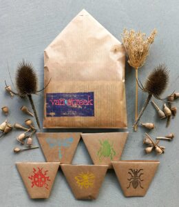Inhoud: huisjesenvelop met vijf handgemaakte en -bedrukte zadenzakjes met beschrijving.