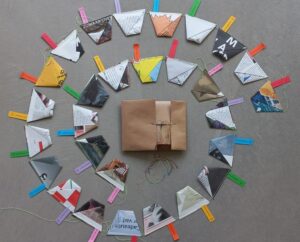 Inhoud: zelfgemaakte envelop met vijf vilten pads met zaden (goudsbloem, juffertje in het groen, oranje cosmos, knoflookbieslook en zinnia) uit onze Kloostertuin, plantenstekertjes en een zaaibeschrijving.